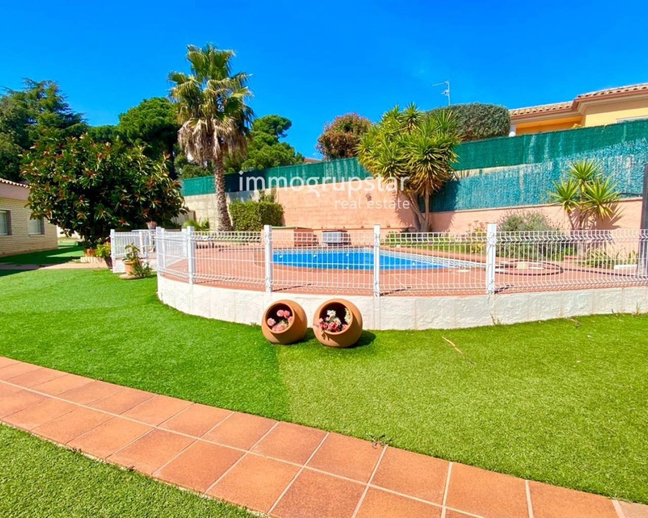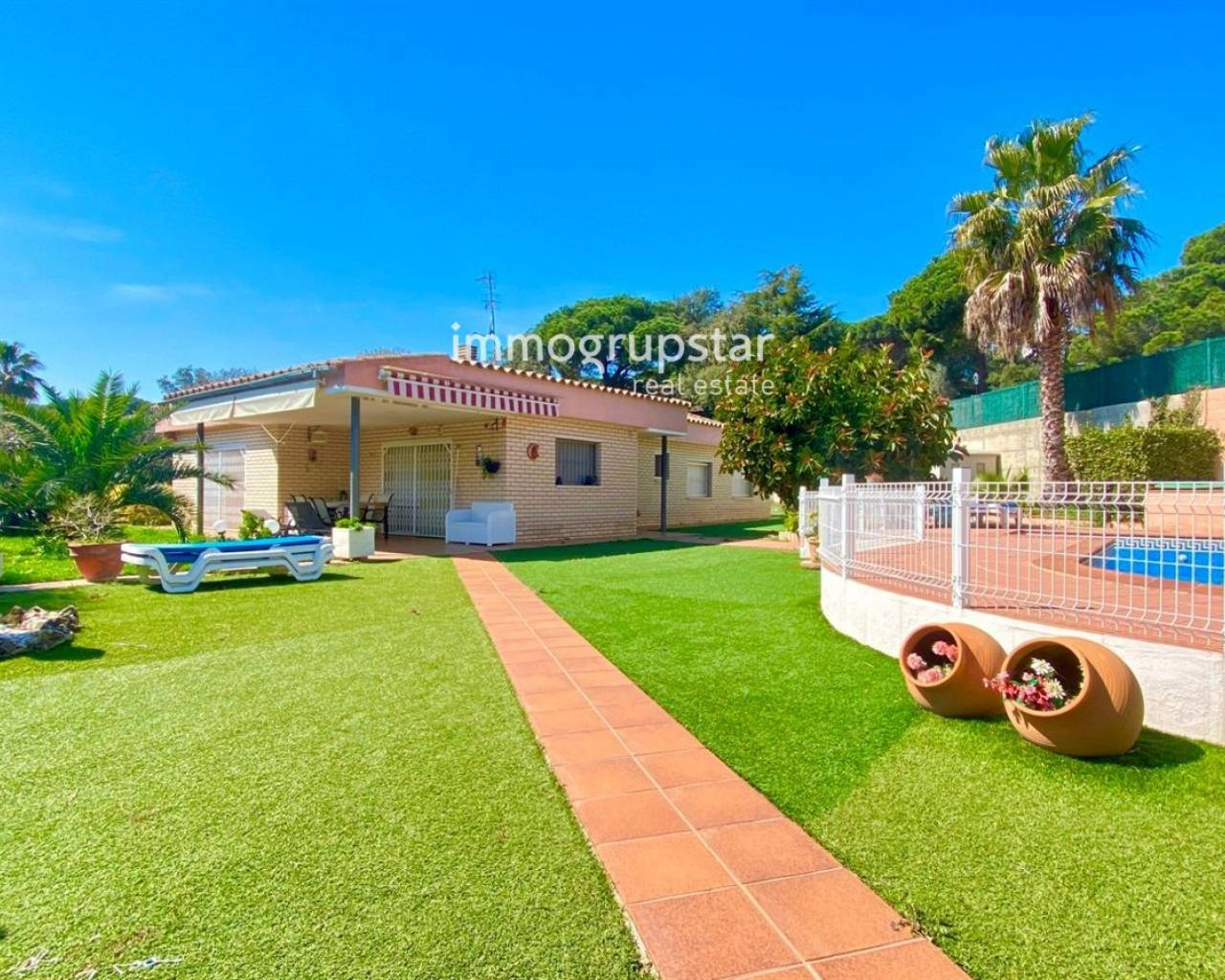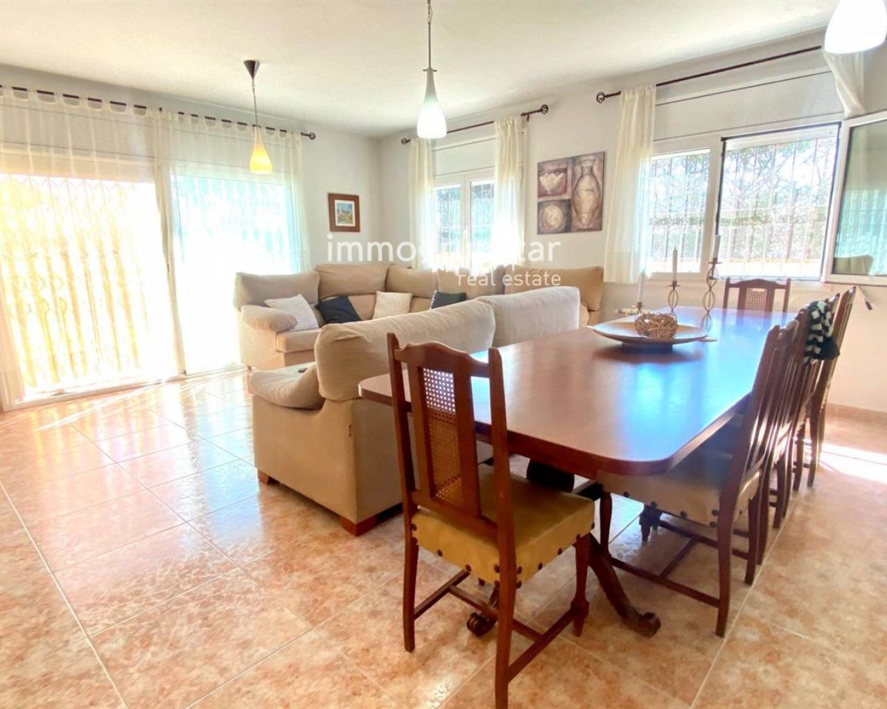 Cette belle maison individuelle de plain-pied est parfaite pour ceux qui recherchent confort et espace. En entrant, vous trouverez un salon spacieux, avec accès direct à un grand porche, idéal pour profiter de dîners en plein air. La maison dispose de 5 chambres doubles et de 2 salles de bain complètes, parfaite pour les familles nombreuses ou ceux qui recherchent un espace supplémentaire pour les invités. La grande cuisine équipée est conviviale pour préparer de délicieux repas pour votre famille et vos amis. Le jardin dispose d'un espace barbecue et d'une piscine privée, idéal pour profiter du soleil et du climat méditerranéen. De plus, le gazon artificiel est facile à entretenir et offre un environnement agréable et accueillant. La maison dispose du chauffage au fioul, confortable pour rester au chaud pendant les journées d'hiver les plus froides. La maison est située sur un grand terrain plat de 1 019 m², orienté sud et est, vous profiterez ainsi du soleil toute la journée. De plus, la maison dispose d'une terrasse et d'un débarras, parfaits pour ranger vos affaires. La maison a été construite en 2002 et est en bon état, prête à emménager pour profiter de votre nouvelle maison. Qu'attendez-vous ? Contactez-nous dès aujourd'hui pour planifier une visite!
